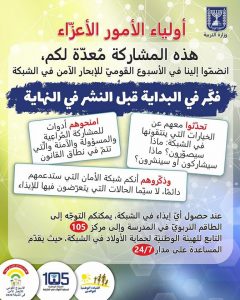ويوم الاثنين تم عرض محاضرة عن بعد " فكر في البداية قبل النشر في النهاية" لشريحة السوابع، ومحاضرة شرطة لشريحة التواسع من اجل توعية الطلاب بمخاطر شبكات التواصل الاجتماعية . وضمن فعاليات أسبوع الانترنت الآمن شارك طلاب شعبة الصفوف الثامنة بفاعلية "نتعلم بطريقة مختلفة" לומדים אחרת .الفعالية كانت تعبر وتحت عنوان التنمر والعنف بشبكة الانترنت