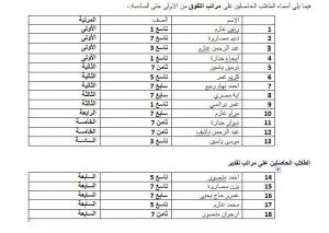 فيما يلي أسماء الطلاب الحاصلين على مراتب التفوق من الاولى حتى السادسة:-